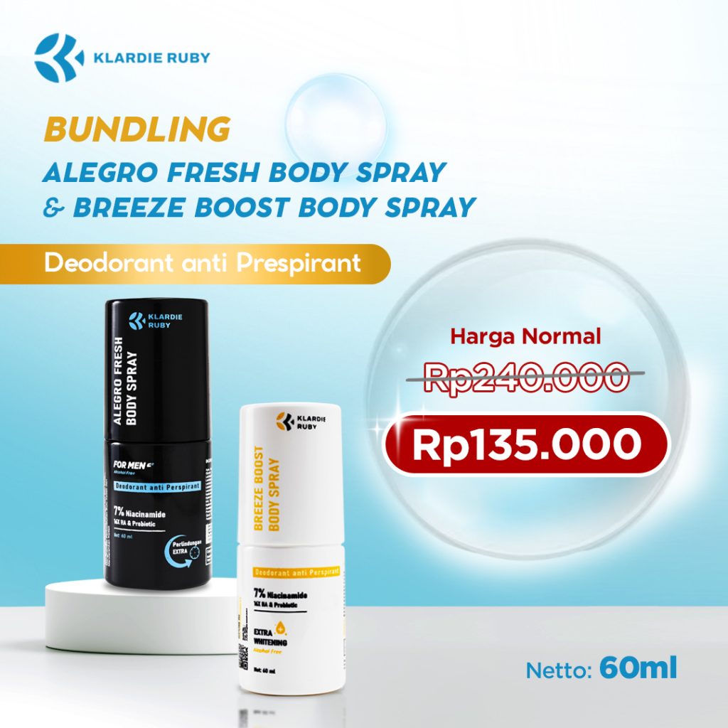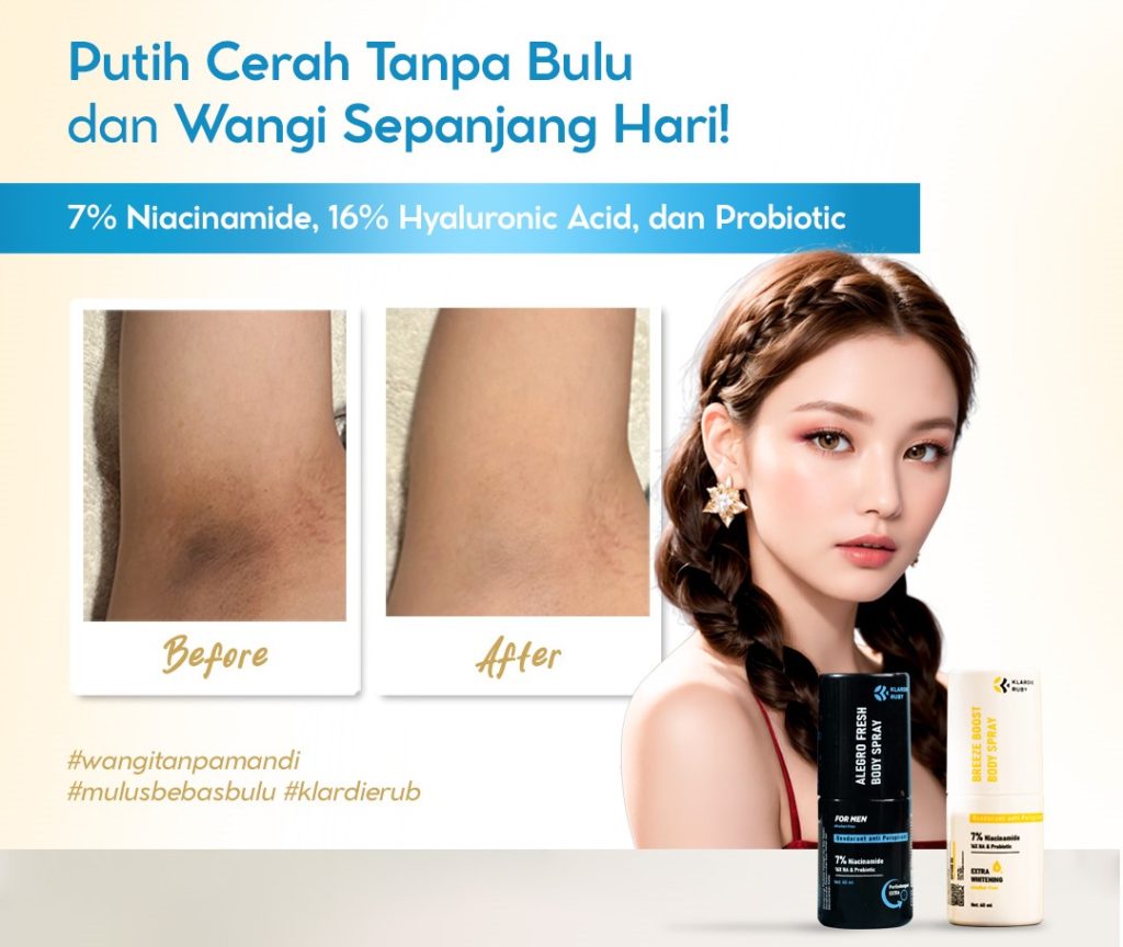 Dengan memakai Klardie Ruby Deodorant Spray ini kamu akan mendapatkan HASIL ketiak anti basah bebas bau tanpa resiko iritasi dan noda, serta kamu tak perlu treatment laser IPL dengan biaya Jutaan, karena dengan kandungan niacinamide 7% akan membuat ketiak putih cerah GARANSI setara laser IPL. dan dengan kandungan Larrea Divaricata Extract akan membantu menghambat pertumbuhan bulu. sehingga kamu tidak perlu lagi repot-repot mencukur ketiak setiap minggunya!